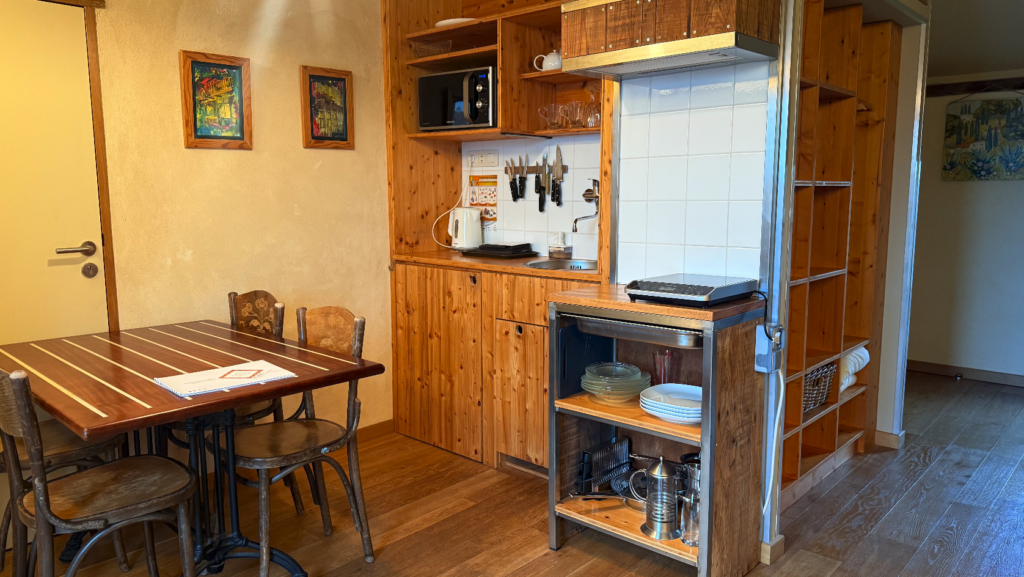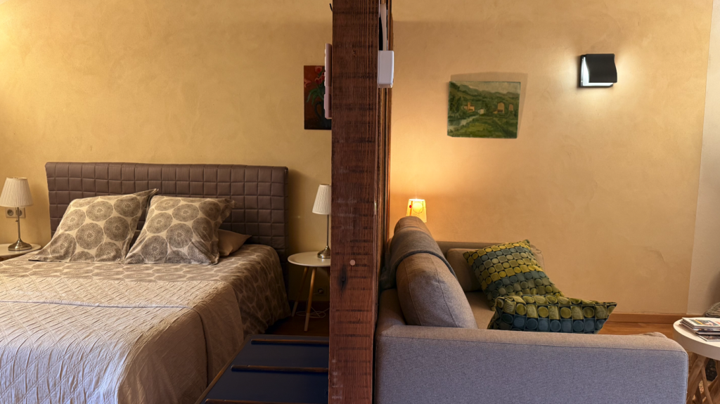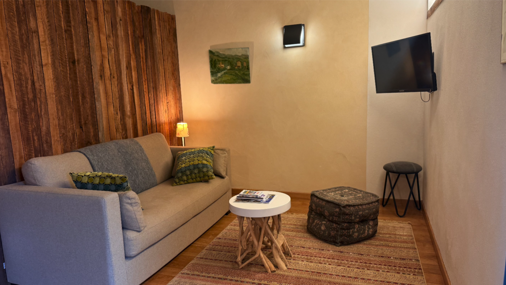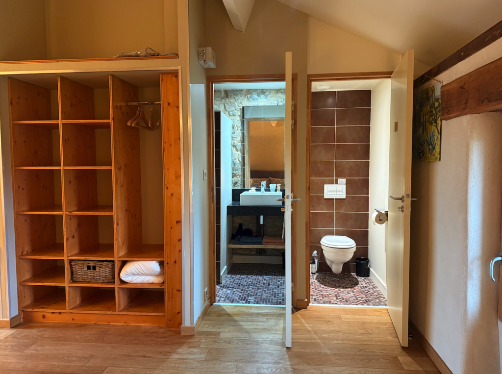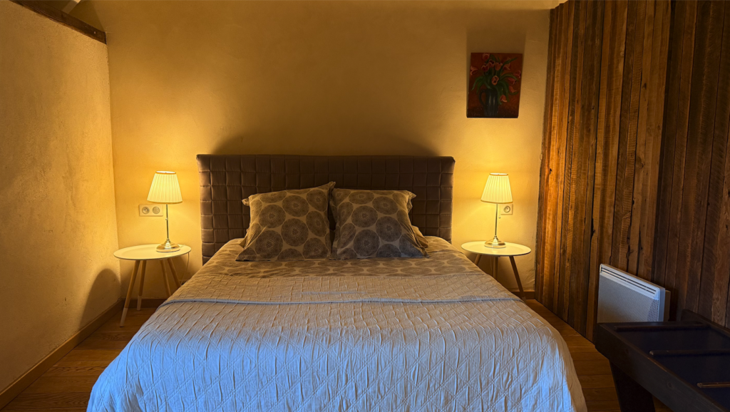 Ce cinquième studio est situé à l’étage du corps de ferme, accessible par une passerelle en bois. Il communique au besoin avec le studio « Le Marais Girard » pour créer un appartement familial. Belle hauteur sous plafond, parquet de bois clair et tons sable et brun créent une ambiance chaleureuse et naturelle.