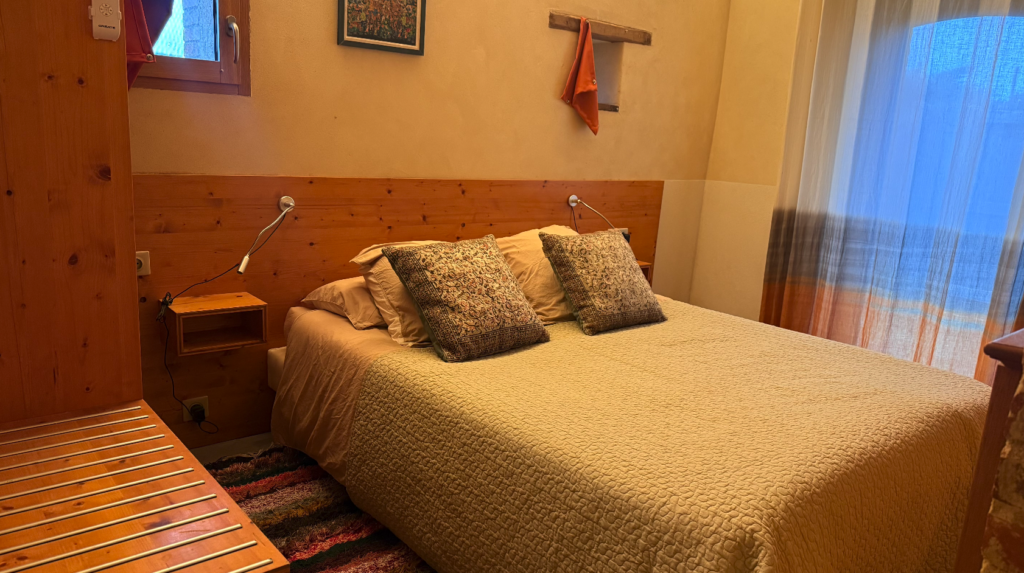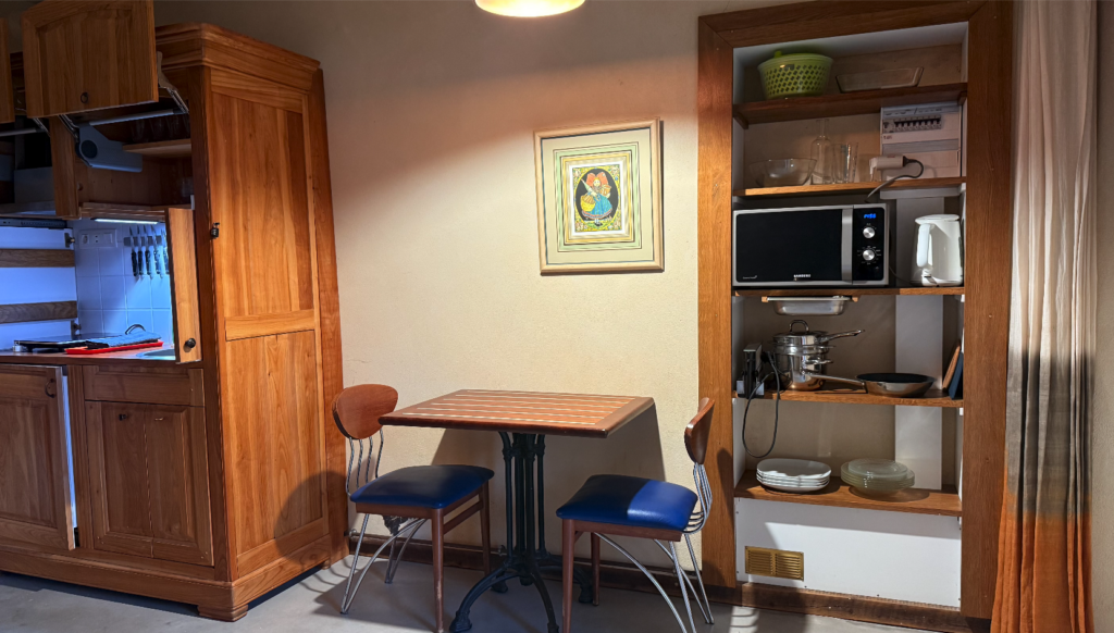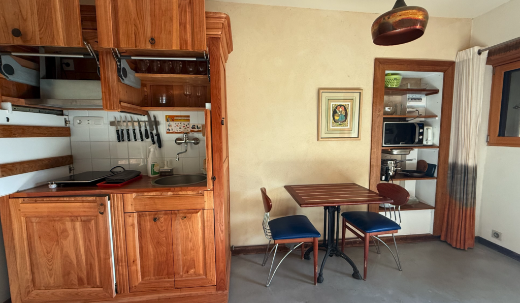 La chambre indépendante, d’une belle hauteur sous plafond, ouvre sur une petite terrasse privée avec sa table forestière. Bénéficiant d’une orientation est, vous pourrez y prendre votre café matinal au soleil.