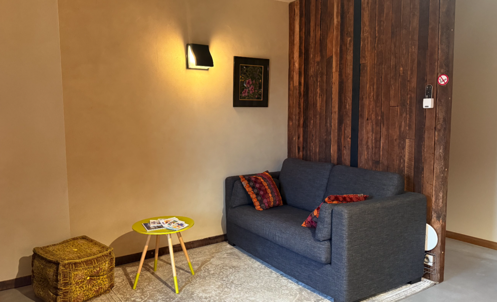 La studio « Les Dunes » se situe au rez-de-chaussée du logis. Ses murs en pierre apparente ou enduits à la chaux-chanvre, son sol en béton ciré, sa décoration font la part belle au naturel.